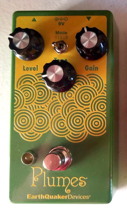 My first indication that the Plumes isn’t just a Tube Screamer clone is the 3-mode clipping switch on the front of the pedal. These aren’t just simple, crunch, more crunch modes either.