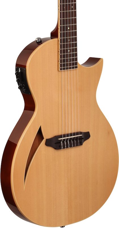The slim body is very comfortable to play. My arm rests roughly where it would on a similar sized electric, say a 335 or big-bodied Gretsch. The neck is nice and comfortable, and really encourages fast playing as well as full, rich chordal work.