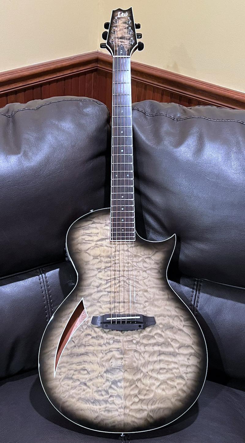 ESP LTD’s TL-6 might be one of the coolest looking guitars I’ve ever seen. The sharper shape of its hole reminds me of the eucalyptus leaves of my childhood, and the sleek, black body screams rock and roll to me.