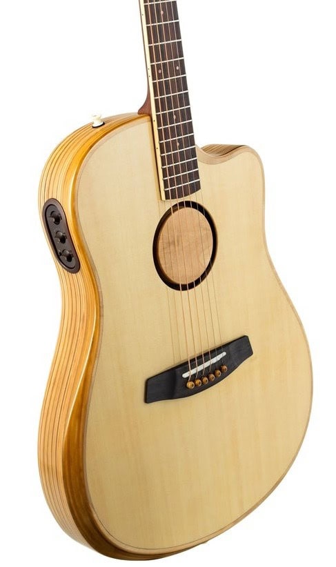 The dual cutaway and the shallow, slim body make for an extremely lightweight guitar. It feels as light as some of the Telecasters I’ve played over the years. Likewise, it makes accessing higher frets much easier than on any other acoustic guitar I’ve tried. I tend not to fret notes beyond the twelfth fret at acoustic gigs, but it’s nice to have.