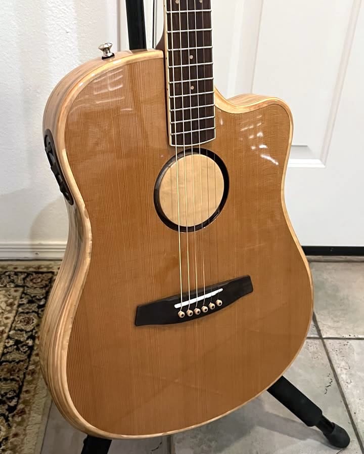 Looking at the Talman out of the box, the dual cutaway absolutely screams “electric guitar.” Think about it: how many acoustics feature double cutaways like a Strat or an SG? Not many.