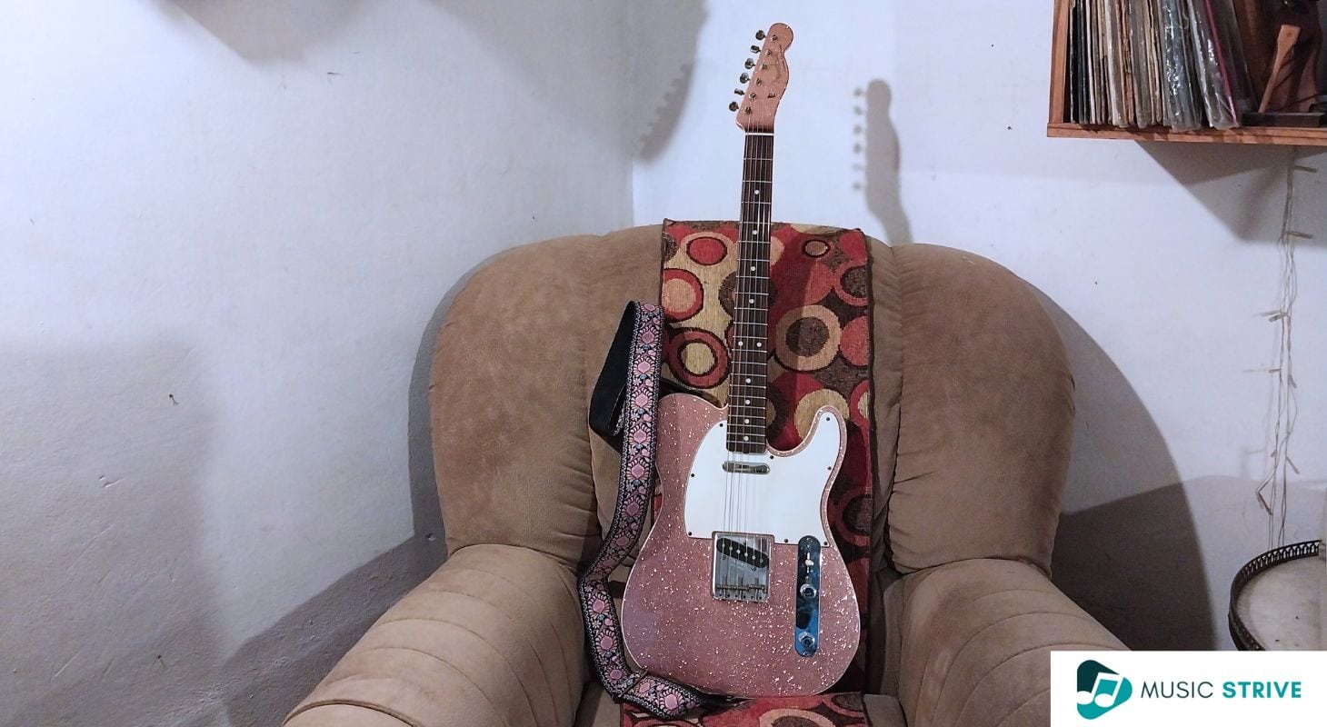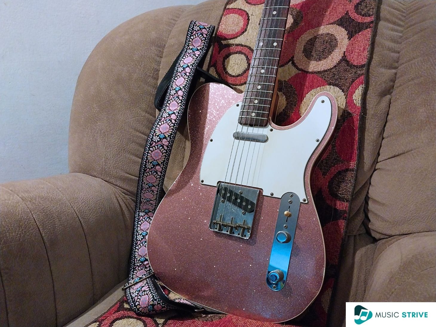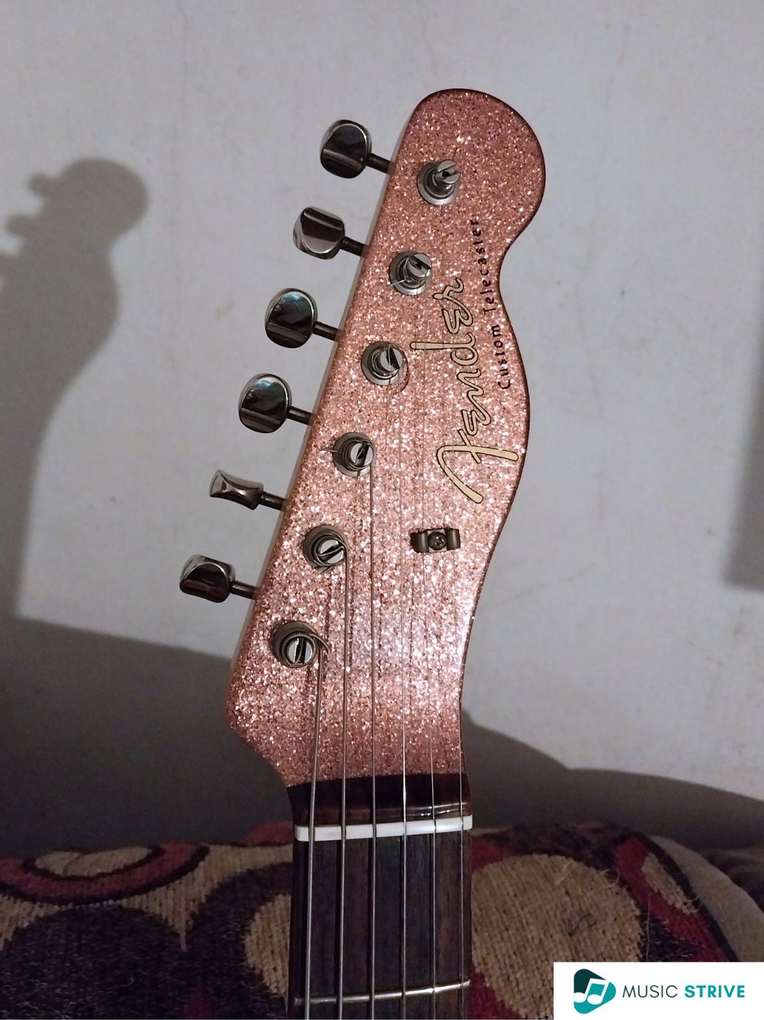 My guitar is a NOS finish (New Old Stock) which means it mimics a guitar that remained inside the box unsold and found 52 years later. It’s a ’60s Telecaster Custom in dazzling champagne sparkle with a matching headstock.