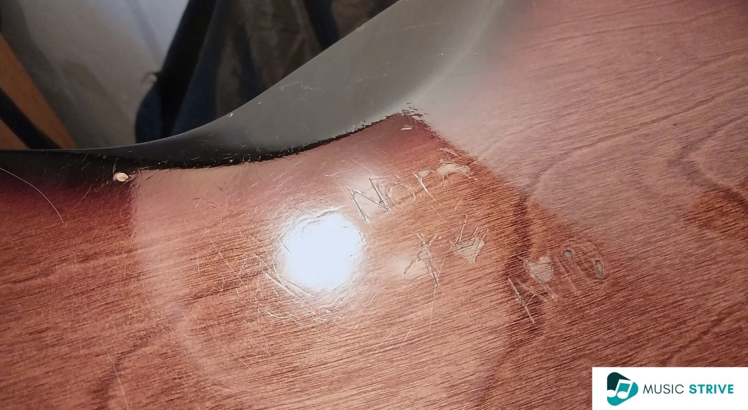 It had a big Rolling Stones tongue logo sticker that occupied the rear of the guitar. As soon as I removed it, I understood why it was there, underneath the sticker there was a love message written with a sharp object. It reads “Nora te amo” with a date from 1992.