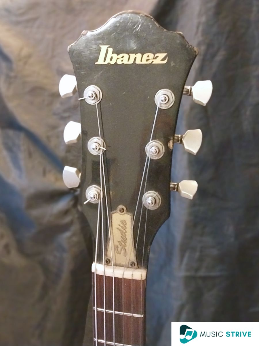 The truss rod cover isn’t made of plastic but of brass and it doesn’t feature Gibson’s bell-like shape but an Ibanez original with the word Studio on it. The Ibanez modern logo sits proudly on top of the headstock that’s far from having that open-book shape.